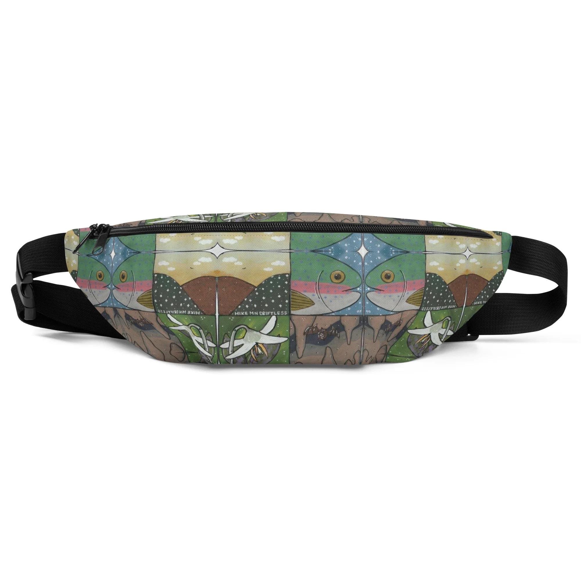 Design by Rachel Tri (see below for more information). Fanny pack featuring Rachel Tri's Driftless inspired art.